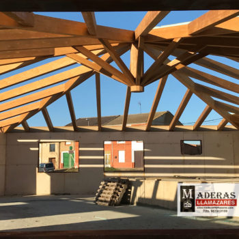 Cubierta hexagonal de 400 m2 realizada en viga laminada de pino mecanizada mediante control numérico.